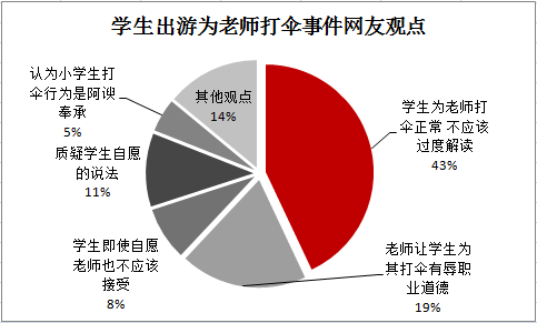 导语:4月30日,网友“@hellhell”曝出一组据称系学生出游给老师打伞的照片在网上广泛传播,5月4日经媒体报道后再往引发热议。对于学生给老师打伞的行为,舆论态度各异。