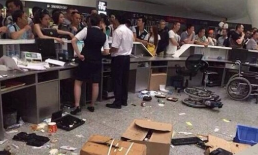 5月16日凌晨,深圳宝安机场因受雷雨影响大面积航班延误,一些愤怒的乘客出现过激行为,在机场打砸。根据网友在微博上报料称,“愤怒的旅客向登机口柜台里丢盒饭,闹登机口。”现场拍摄的图片显示,机场服务台和登机口被乘客围堵,服务台地上一片狼藉,地上到处是泡面、盒饭还有矿泉水。有特警围成人墙维护秩序。