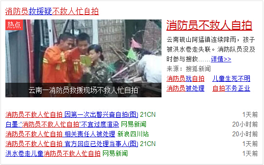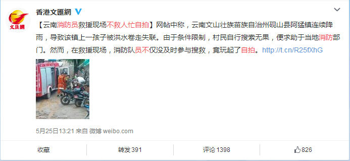 事发:5月21日,一个名为《砚山消防官兵救援现场不救人忙自拍》的帖子在百度砚山吧广为传开。贴文称,云南文山壮族苗族自治州砚山县阿猛镇连续降雨,导致该镇上一孩子被洪水卷走失联。由于条件限制,村民自行搜索无果,便求助于当地消防部门。然而,在救援现场,消防队员不仅没及时参与搜救,竟玩起了自拍。据乐思舆情监测系统数据显示,截止21日17时,该帖文已有462人查看,7人发表了回复质疑,并在腾讯微博、微信、新浪微博等媒体上进行了大量转载。
