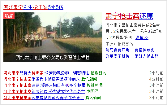 6月9日13时15分,河北沧州市公安局官方微博“沧州公安网络发言人”通报了肃宁枪击案概况,随后,人民网、腾讯、中国新闻网、新浪新闻、凤凰网、搜狐新闻的超过100家 媒体对该新闻进行了转载报道,并在微博、微信公众平台、论坛、贴吧等不断传播,引发舆论热议和大量网友围观,话题舆情热点快速上升。