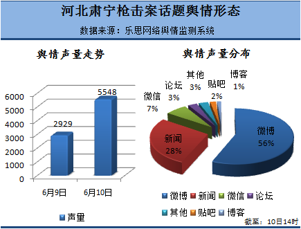 据乐思网络舆情监测系统“肃宁枪击案”专题数据显示,截止6月10日14时,“肃宁枪击案”话题舆情总量达8477条,其中微博声量达4789条,占总声量的56%。新闻报道量2370篇,占总舆情声量的28%。在微信公众评论、论坛、贴吧、博客上,该话题都引起较大的关注。从舆情走势来看,9日媒体报道“肃宁枪击案”后,该话题舆情声量就快增长,当天达到2929条。10日,舆情传播声量增速加快,至当天14时当天舆情声量达5548条,“河北特大枪案”话题百度热搜指数高达124856次。目前,该话题热议依旧不减,呈上升之势。