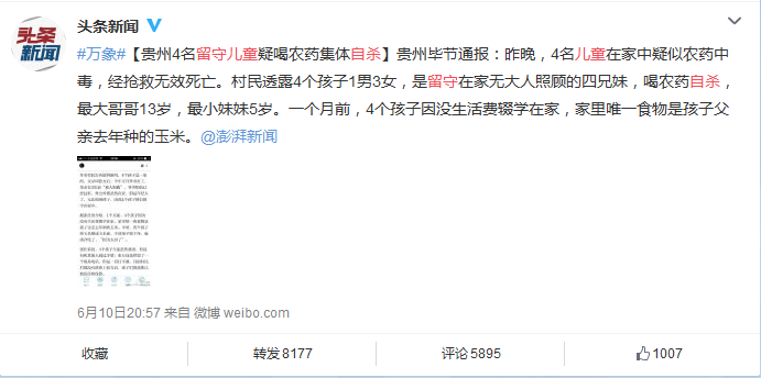 据乐思网络舆情监测系统数据统计:6月10日,贵州毕节市七星关区政府发布该区4留守儿童中毒身亡的消息,随后该新闻被腾讯、凤凰、网易、搜狐、人民网、新华网等众多媒体关注转载,截至11日17时,该话题新闻报道721篇。其中腾讯新闻10日20时8分的报道吸引网友评论58825条,为该话题参与度最高的单篇网络新闻。在微博方面,该话题新浪微博一级传播201条,其中“@头条新闻”10日20时57分发布的该话题新闻被转发8177次,评论5898条,点赞1007次。目前,该事件因为后续结果尚未明朗,事件仍处在不断发酵中。