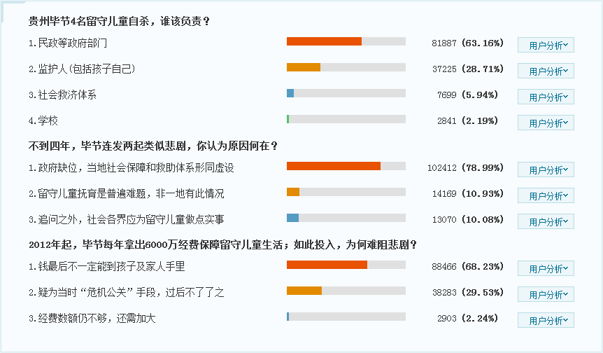 毕节4个留守儿童喝农药自杀,消息一次立即点燃舆论怒火,政府救助不力、慈善落实不到位、社会冷漠等各种谴责之声一片,社会救助制度和监护人制度的完善问题再次成为舆论反思的焦点。面对如潮的谴责声,当地部门做好应对平息舆论怒火需要从三个方面着手。第一,及时调查事件真相向社会公众公布。留守儿童自杀事件发生后,引发极大的舆论轰动,这是公众对事件真相最为期待,而政府部门及时发布调查信息可以防止信息发布滞后引发谣言滋生。第二,实事求是,做好问责处罚。面对如此惨剧,舆论问责声不绝于耳,呼吁处罚相关责任人呼声极高。这时需要明确相关部门责任人失职问题和行为,做到有错必罚、失职必惩,凸显政府的公信力。第三,查漏补缺,完善相关制度缺陷。从舆论聚焦点来看,悲剧发生后,大量网友把悲剧的原因指向政府的救助制度和监护人制度不完善,呼吁建立可取的监护人制度和救助制度。而作为政府部门,需要查漏补缺,完善相关制度存在的不足,及时社会通报完善情况,一方面可以缓解公众负面情绪,同时也是对今后此类悲剧再次发生的预防。