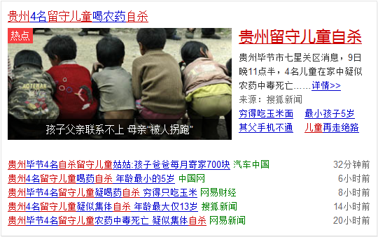 @ 奇迹:看了这种新闻有种要窒息的感觉,太难受了,到底是什么把这些孩子逼到自杀的地步!难受,中国有钱的人富的流油,没钱的竟然饭的没有吃,悲剧啊!