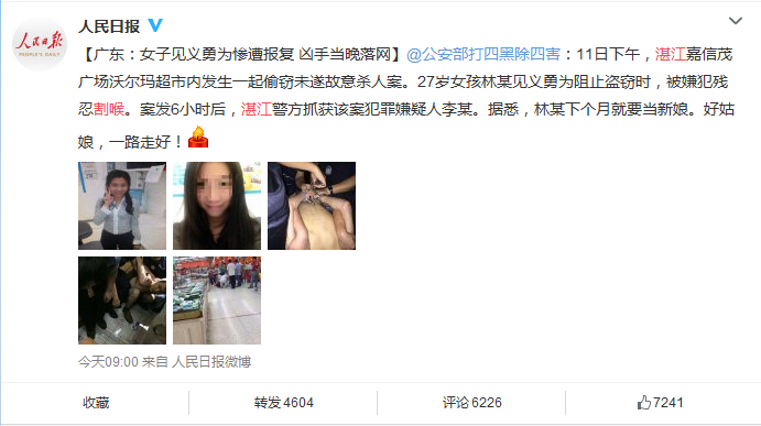 6月11日,一条“湛江沃尔玛女主管被割喉”的消息在网上炸开锅,引来各方舆论围观。如此惨烈的悲剧引来网友同情声一片的同时,不少网友对见义勇为的后果表示担心,还有部分网友由此对中国死刑展开议论,认为死刑重罚需要保留。如此一场惨剧发生,必会引起社会舆论公愤和公众心理恐慌,面对舆论压力,湛江警方6个小时内快速破案,并及时向社会通报案情进展和情况,很好的疏解了公众的恐慌情绪发酵,同时也遏制了谣言滋生的可能。在这起重大涉警舆情事故中,湛江警方能够快速侦破案件、及时通报案情,有效避免侦破不力、信息不通可能造成的舆情危机发酵,是涉警舆情处置一个很好的案例。