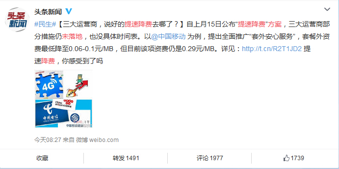 据乐思网络舆情监测系统数据统计,6月15日中新网跟踪报道“宽带提速降费方案未落地 ”的情况后,在网上引起较大反响,网易新闻、搜狐财经、新浪新闻、齐鲁晚报、人民网等近100家媒体对该问题进行转载报道,截至6月15日17时,该话题新闻量达947篇。在微博方面,“宽带提速降费方案未落地 ”引发较大范围热议,新浪微博一级传播938条,其中“@头条新闻”该话题微博被转发1491次,评论1977条,点赞1739次。另外,在百度6月16日的实时热点排行榜,“提速降费方案未落地”话题搜索指数高达435183次。从目前的舆情传播走势来看,因为宽带提速降费方案涉及公众利益面广,所受关注度高,如果宽带提速降费方案迟迟难以落地可能会引发更大的负面影响。