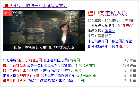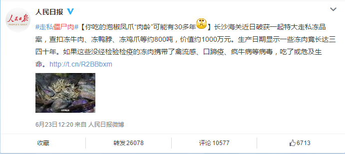 6月23日,新华网长沙一篇题为《走私“僵尸肉”窜上餐桌,谁之过?》在网上引发舆论轰动。报道称,有的比一些年轻人年纪还大的“僵尸肉”通过走私入境,悄无声息地出现在宵夜摊、餐厅。这些肉有的来自疫区,有的严重过期,用化学药剂加工调味品后居然摇身一变成为“卖相”极佳的“美味佳肴”,威胁着百姓的食品安全。