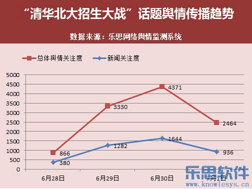清华北大招生组在微博互掐一事迅速引发网友和媒体关注和热议,随后清华北大两招生组都删除对掐的相关微博,但事件持续发酵。随即又曝出在广东执信中学,清华北大两校招生老师为争抢一名全省理科前十的女生,甚至将人逼到了墙角。类似新闻相继曝出,事件舆情进入高潮。