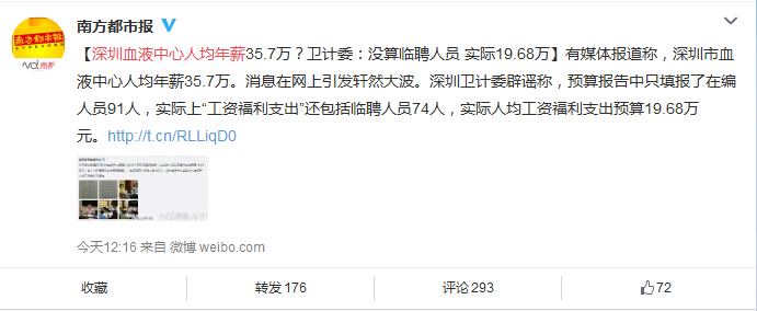 7月7日8是19分,《广州日报》一篇“深圳市血液中心人均薪酬支出35万”的新闻引起舆论关注和热议。报道称,据深圳市卫计委发布的《2015年深圳市卫生和计划生育委员会部门预算》(以下简称《预算》),今年深圳卫生和计划生育委员会部门预算收入165468.67万元,比去年增加38821.67万元,增长30.65%。《预算》的说明称,今年起深圳市疾病预防控制中心等4个单位实行收支两条线管理,事业收入17859.00万元置换为财政拨款。同时,今年起市医学继续教育中心纳入部门预算管理,收入规模增加6544.43万元。