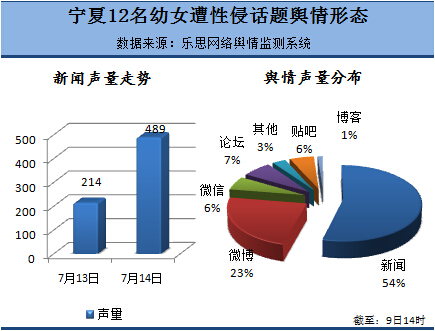 据乐思网络舆情监测系统数据显示,从7月13日新京报再次报道“宁夏灵武12名幼女遭老师性侵”事件开始,截至7月14日该事件舆情总声量1301条,其中新闻报道703篇,占比54%,微博一级传播299条,占比23%。其他微信、论坛、博客、贴吧等都有小量传播,媒体成为该事件再次被关注的主导因素。从媒体声量走势来看,媒体两天对该话题报道呈上走势。7月13日“宁夏灵武12名幼女遭老师性侵”报道发表后,媒体转载量达214篇,7月14日更是翻倍增长达到489篇。虽然7月15日该事件报道开始大幅缩水,但因事件矛盾仍未解决,事件仍然有再次发酵的可能。