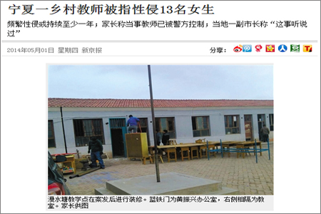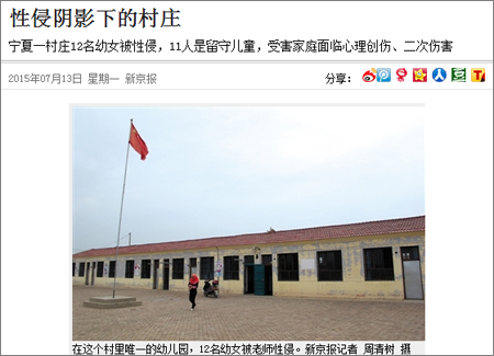 7月13日,新京报以《性侵阴影下的村庄》为题报道了“宁夏一村庄12名幼女被老师性侵”的消息引起舆论广泛关注。报道称,2013年至2014年4月期间,宁夏灵武一村子里,12名4至6岁幼女在幼儿园被教师黄某多次性侵,54岁的黄称:“这些女孩可爱,只是玩玩。”黄会给孩子几毛钱或零食,并威胁她们不许告诉家长。 媒体大量转载报道后,该事件开始在微博、微信公众号等平台传播并引起公众的积极关注和议论。