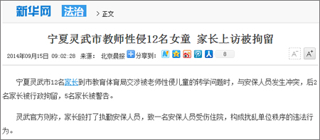 2014年9月14日,沉寂几个月后,多家媒体再次综合报道了“宁夏教师性侵12名学前班女童,家长上访被拘留”一事引起舆论关注热议。媒体称,9月10日,12名家长到市教育体育局交涉4月19日宁夏灵武被老师性侵的儿童的转学问题时,与安保人员发生冲突,后2名家长被行政拘留,5名家长被警告。消息曝出后,新华网、人民网、中国网、国际在线、光明网、和讯网、腾讯、新浪、网易、搜狐等多家主流媒体网站报道和转载了此事。@人民网、@财经网、@头条新闻、@京华时报、@辽视说天下、@半岛晨报、@沈阳网、@新华日报、@新消息报、@宁夏日报等热门媒体微博也纷纷转发,该事件再次在网上引起广泛热议,形成第二次舆情高潮。