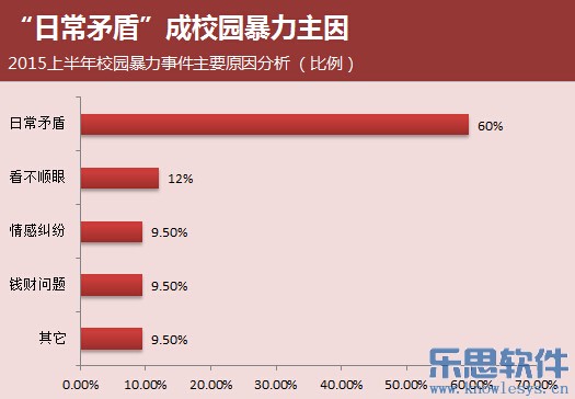 2015上半年媒体曝光的主要校园暴力事件中,因“日常矛盾”而引发的占60%,成校园暴力主因;此外,只因看不顺眼所引发的校园暴力也值得注意,占12%比例。而因情感纠纷和钱财勒索等问题所引发的校园暴力也占一定比例。