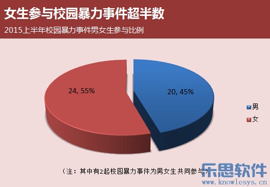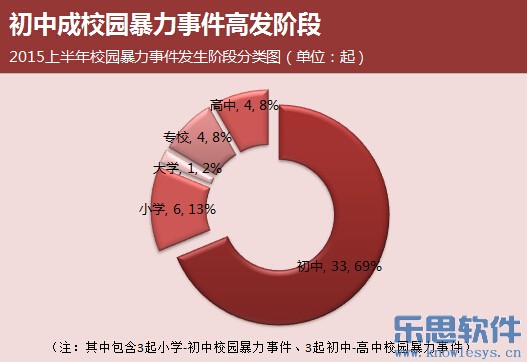 2015上半年媒体曝光的校园暴力事件主要有42起,其中初中生参与的校园暴力事件33起,占总数69%,初中成校园暴力事件高发阶段;此外,小学阶段以13%的比例成校园暴力事件的第二高发阶段。