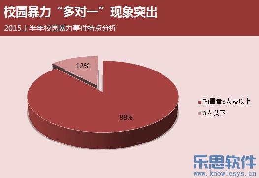 2015上半年媒体曝光的校园暴力事件中,施暴者3人及以上的占88%比例,施暴者具有群体性,而受害者基本上都是一人,“多对一”施暴现象突出。