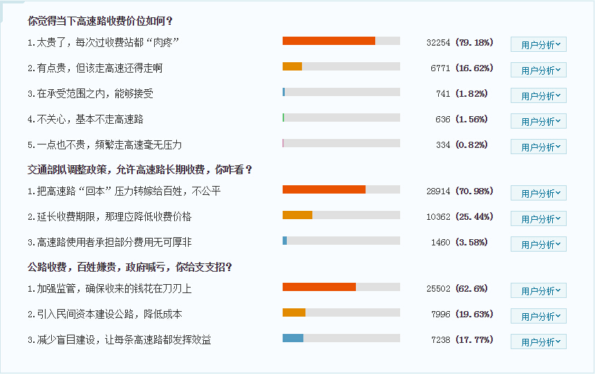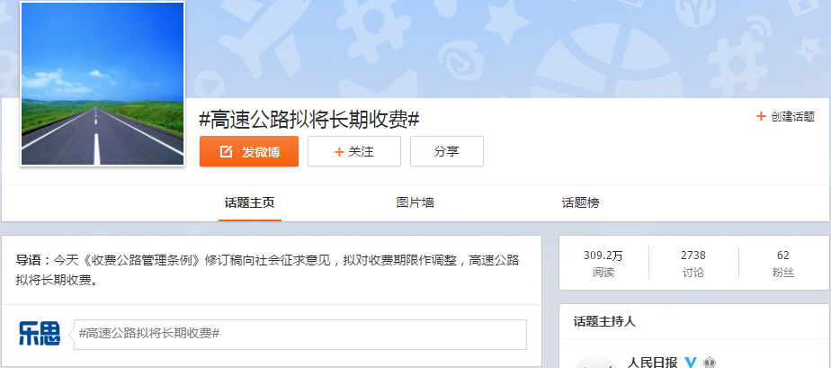 微博方面,新浪微博该话题热议一级传播博文92634条,其中“@头条新闻、@人民日报”的博文转发量均超过800次,评论均超过1300条,且微博话题#高速公路拟将长期收费#被阅读305.7万次,热议评论2629条。而在微信、论坛、贴吧等平台,“高速拟长期收费”话题传播度和关注度相对较低,网友参与活跃度也相对较小。从网络舆情来看,该话题舆情聚焦在是否应该长期收费的问题上。