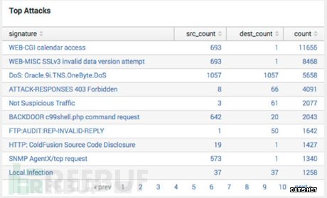 这张表是设计用来快速识别误报及需要优先处理的报警的,采用的是典型的TOPN 方式。不难发现这个TOP攻击的表要比我们常见的多了攻击源和目的的计数,因为产生报警数量特别巨大的签名可能是误报,也可能是需要优先处理的,单纯从报警数量上难以做判断,这里加入源和目的的计数,就可以进行初步的判断: