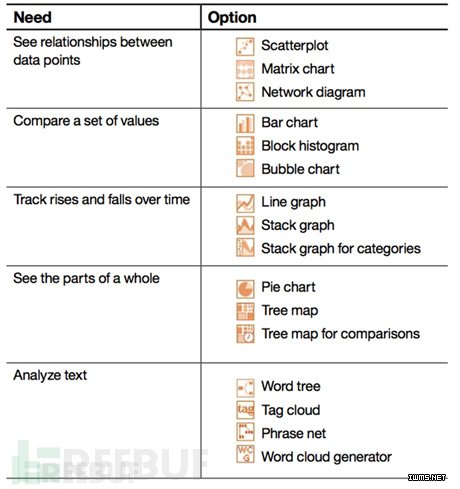 这个方面的知识比较成熟,各种资料和研究各种可视化方法的用途有充分的研究,就如下面从IBM的《Choosing a successful structure for your visualization》一文截取的图表:
