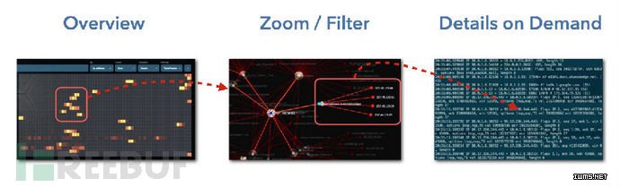 在可视化相关的文章中,树图的发明者,本-施奈德曼教授在其论文《眼见为实》(The Eyes Have It)中这句话最经常被引用“先总览,再缩放并筛选,然后按需寻找细节”,这句话在说明可视化中典型交互模式的同时也表明了分析需要良好的交互操作的。 Raffael Marty (国际权威的安全数据分析和应用安全可视化专家之一,安天组织的ISF2014中做过首发演讲)对这个模型做了形象化的展示: