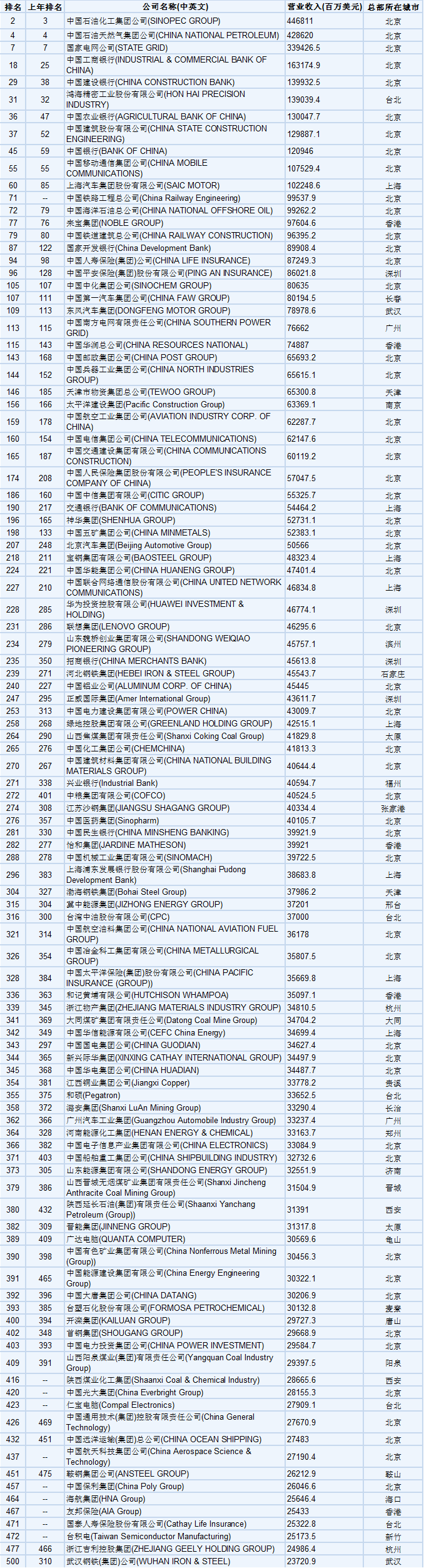 今年排名前三的公司依次为:沃尔玛、中石化、壳牌石油。中石化在榜上排名比去年上升一位,排名超过壳牌石油,成为榜单亚军。