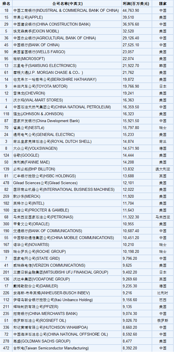 如果按利润将所有上榜公司从高到低排列,中国工商银行以447.6亿美元的利润成为今年世界500强利润最高的公司。
