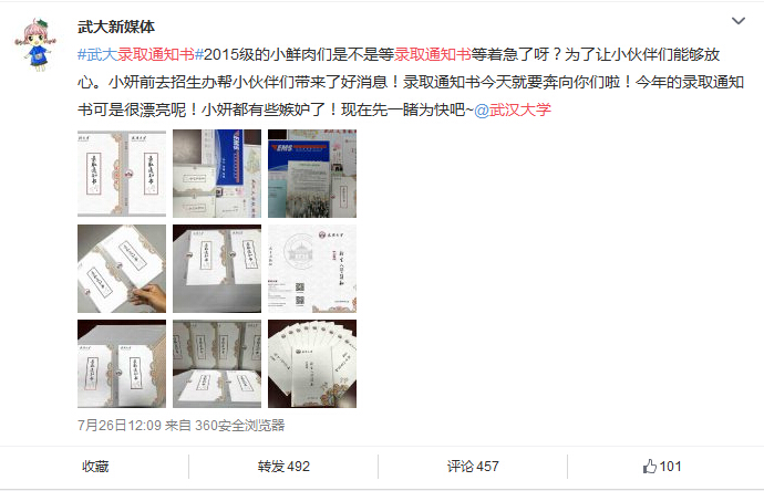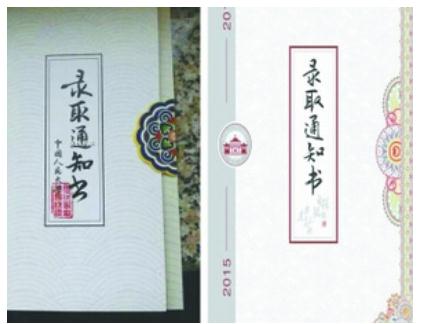 7月26日,武汉大学2015年新版录取通知书,亮相其新媒体中心官方微博“武大新媒体”,竖式排版、题签、毛笔字体、龙腾鱼跃纹镶边,浓郁的传统文化元素引来一片赞声。武汉大学的官方微信也自称新版录取通知书“颜值爆表”“美丽的我”。