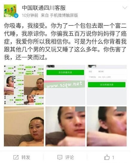 该事件发生于今日中午12时50分前后。认证为“四川联通3G微宝典官方官博”的@中国联通四川客服发布多张女性赤裸照和数张微信聊天记录截图,并配文称,“你吸毒,我接受。你为了一个包包去跟一个富二代睡,我原谅你。你骗我五百万说你妈妈得了癌症,我爱你所以我相信你。可是为什么你背着我跟其他几个男的又玩又睡了这么多年。你伤害了我,还一笑而过。”此后,该官微再次转发此条微博,指责蔡某某“当了婊子就别立牌坊”。