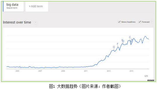 在这样的认知下,“大数据”日趋变成大家“耳熟能详”的热词。图1所示的是谷歌趋势(Google Trends)显示的有关大数据热度的趋势,从图1中可以看到,在未来的数年里,“大数据”的热度可能还是“高烧不退”(图1中虚线为未来趋势)。