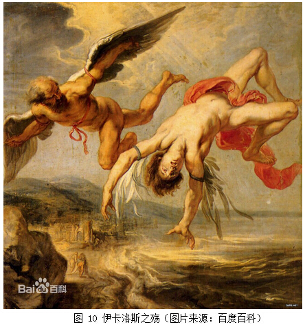 在希腊神话中,伊卡洛斯是个自负的天神,他是代达罗斯的儿子,一天,在与父亲代达罗斯使用蜡和羽毛制造的羽翼逃离克里特岛时,由于他过分相信自己的飞行技,故而飞得太高,双翼上的蜡在太阳照射下融化,羽翼脱落,最终导致自己葬身大海。
