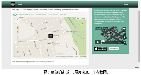 波士顿市政府推荐自己的市民,使用一款智能手机应用——“颠簸的街道(Street Bump,网站访问链接:http://www.streetbump.org/)”。这个应用程序,可利用智能手机中内置的加速度传感器,来检查出街道上的坑洼之处——在路面平稳的地方,传感器加速度值小,而在坑坑洼洼的地方,传感器加速度值就大。热心的波士顿市民们,只要下载并使用这个应用程序后,开着车、带着手机,他们就是一名义务的、兼职的市政工人,这样就可以轻易做到“全民皆市政”。市政厅全职的工作人员就无需亲自巡查道路,而是打开电脑,就能一目了然的看到哪些道路损坏严重,哪里需要维修,如图3所示。