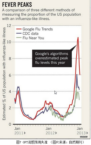 谷歌工程师们开发的GFT,可谓轰动一时,但好景不长,相关论文发表4年后,2013年2月13日,《自然》发文指出【12】,在最近(2012年12月)的一次流感爆发中谷歌流感趋势不起作用了。GFT预测显示某次的流感爆发非常严重,然而疾控中心(CDC)在汇总各地数据以后,发现谷歌的预测结果比实际情况要夸大了几乎一倍,如图7所示。