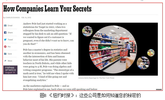 2012年2月16日,《纽约时报》刊登了Charles Duhigg撰写的一篇题为《这些公司是如何知道您的秘密的》(How Companies Learn Your Secrets)的报道【15】。文中介绍了这样一个故事: