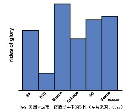 根据对这些数据的分析,Uber 推断出那些发生一夜情的时间和地点,并将这些地点在纽约(NYC)、旧金山(SF)、波士顿(Boston)以及其他美国城市的地图上进行标注,得出一夜情频繁的高发区。数据分析发现,波士顿位于美国“一夜情”之首,而纽约人则显得比较保守,“一夜情”的比率仅仅为波士顿的1/5。在时间节点上,一夜情 “发作”的高频发段是在周五和周六晚上,如果你的另一半在这个时间点上说自己工作忙要加班,你就要“悠着点”相信。