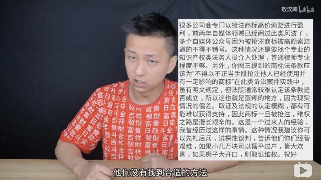 8月3日,敬汉卿发布了一段视频详细说明了事情经过,并发现他的朋友也遭遇过类似的事情。实际上这类抢注商标再勒索的事情屡见不鲜,很多公司都会专门以抢注商标高价索赔进行盈利,前两年自媒体领域已经闹过这类事情,多个自媒体公众号因为被抢注商标被高额索赔逼得不得不销号,实际上就是“合法合规的勒索”。而且,法院界定法律规定的“不得以不正当手段抢注他人已经使用并有一定影响力的商标”是非常困难的,维权之路漫长而艰辛。除了交钱了事,他们都没有找到合适的办法。