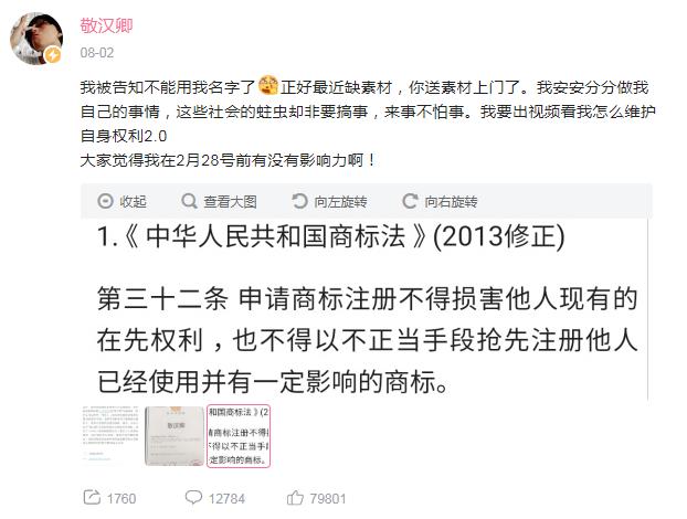 通知函称目前该公司持有“敬汉卿”注册商标41类使用权利,要求敬汉卿及时整改他所运营的各大社交自媒体账号名称,否则就律师函警告。