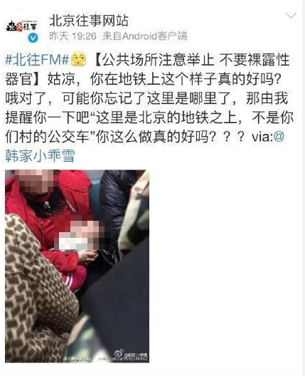 “公共场合请注意举止,不要露出性器官”。11月27日11时许,北京往事网站的官方微博上转发了网友@韩家小乖雪发布的一张照片。照片中一位身着红色衣服的母亲正抱着孩子坐在地铁座位上进行哺乳。@韩家小乖雪在原微博中提到“菇凉,你在地铁上这个样子真的好吗?”、“这里是北京地铁,不是你们村的公交车,你这么做真的好吗??”等言辞。