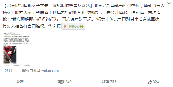 直到11月29日下午,当事人的丈夫看新闻,才知道自己的妻子被偷拍并被发了微博。方先生说,这种把他妻子哺乳照片不经处理就发在网上,还附带语言攻击的行为让他非常气愤,事发后他曾发私信给拍照者要求删除微博,但一直未得到理会。而北京往事网站的“公开致歉”也让他觉得非常敷衍,“完全是在推卸责任”。方先生说,他已与律师取得联系,将以涉嫌侵犯隐私权和名誉权为由,起诉新浪、拍照者和北京往事网站,通过司法程序维权。