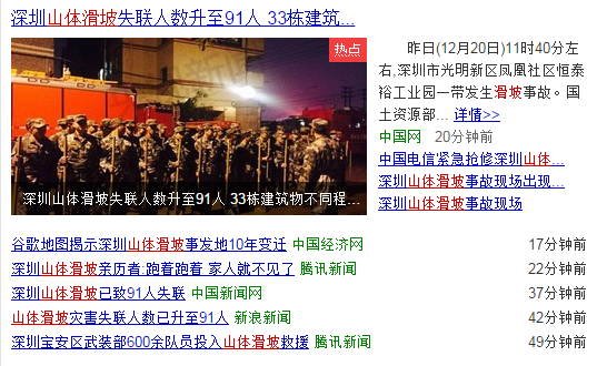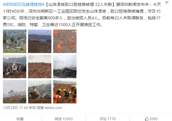据乐思舆情监测系统12月21日的监测数据显示,12月20日该事件发生后,媒体及时的报道了受灾情况,迅速在网上发酵,有中国网、凤凰网、搜狐网、人民网等超过200家的媒体报道了该事件,新闻量高达407篇,百度网页搜索到115,000个相关内容。其中央视新闻的新浪官方微博12月20日也发布了关于此事件的微博,截至21日12时,评论量为1778条,转发量为12503条。该事件的舆论逐渐走高,主要是广大网友为失联人员祈福,以及希望政府尽快公布事故原因,还大家一个真相。