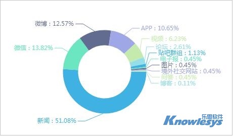 乐思软件舆情监测数据显示,截至目前此次舆情监测媒体构成类型中,排在采集来源榜前三位的是新闻、微信和微博。新闻媒体是最重要的信息发布平台,数据占比为51.08%,微信和微博分别占13.82%和12.57%。