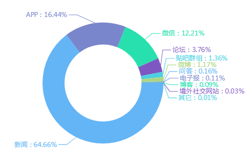 截至12月13日,此次舆情传播媒介分布中,排在采集前三位的是新闻、APP和微信。新闻数据占比为64.66%,APP和微信分别占16.44%和12.21%。