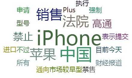 此次舆情事件中,高频词主要是:“iPhone”、“苹果”、“中国”、“销售”、“法院”等。