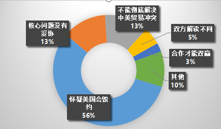 根据乐思软件舆情监测系统提取出的数据,将其聚类并抽样统计,得出六个话题。怀疑美国会毁约约占56%,认为核心问题没有妥协13%,认为不能彻底解决中美贸易冲突约占13% ,认为双方解读不同约占5%,认为合作才能双赢约占3%,其他情况约占10%。