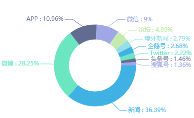 上图显示舆情媒介占比最多的是新闻,所占比例达36.39%,其次是微博,占比为28.25%;再次为APP,占比为10.96%。这表明主流的新闻媒体网站和微博、APP等自媒体在舆情传播中起到了主导作用。