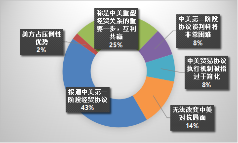 国外的媒体的观点倾向呈现多元化,正负中性的评价都有,主要的负面评价有:认为中美第二阶段协议谈判料将非常困难,认为中美贸易协议执行机制被指过于简化和认为无法改变中美对抗局面等。在进行舆情研判和公关的时候,要针对主要负面问题做解答,防止问题的扩散和发酵。