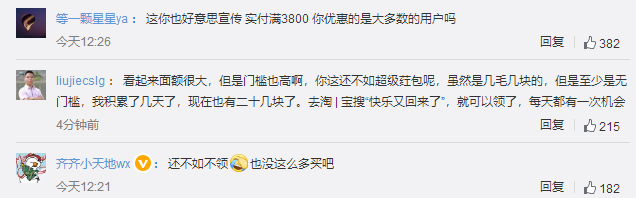 而在微博用户@天猫发言人发布的“开通88VIP,能领到的大额券总额度可以达到900元,买大型家电、化妆品的小伙伴们走过路过,千万不要错过这次机会喔。”中网友集中表示“88vip的优惠政策对普通用户也有效”表示“这你也好意思宣传,实付满3800,你优惠的是大多数的用户吗?”