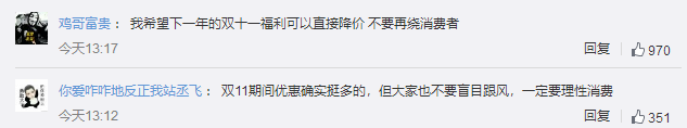 其中,“我希望下一年的双十一福利可以直接降价,不要再绕消费者”评论获得最多网友回复点赞,其次’双11期间优惠确实挺多的,但大家也不要盲目跟风,一定要理性消费”也有较多网友表示赞同认可。