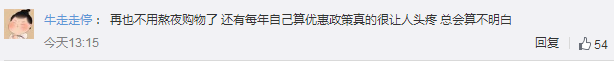 还有部分网友对本年度双十一开始时间选择到晚间八点开始表示“再也不用熬夜购物了,还有每年自己算优惠政策真的很让人头疼,总会算不明白”同时也表示优惠政策还是比较绕的。