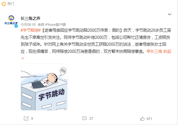 23日,字节跳动28岁员工吴先生不幸离世的消息引发关注。随后,乐思舆情监测中心关注到有关赔偿两千万的信息传播广泛。