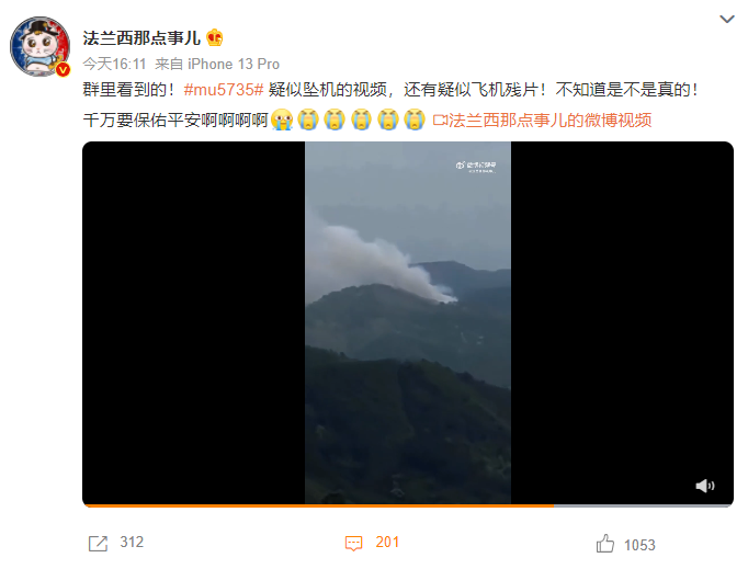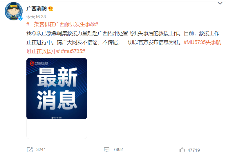 视频及自媒体平台都以话题形式传播扩散开,#一架客机在广西藤县发生事故# #mu5735# #民航局确认东航一架飞机坠毁# 等话题在微博及抖音等媒体和视频平台引发大量传播,#一架客机在广西藤县发生事故#在微博引发阅读9.5亿 讨论200.1万;#mu5735#引发阅读7.7亿 讨论52.7万;#民航局确认东航一架飞机坠毁#引发阅读3.3亿 讨论5.9万。