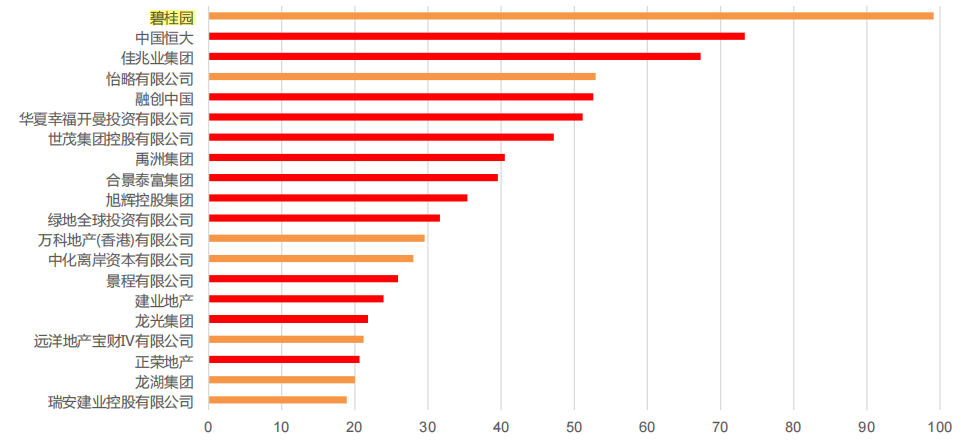 图 前20名房企中资美元债存续规模(亿美元)(标红为违约主体)